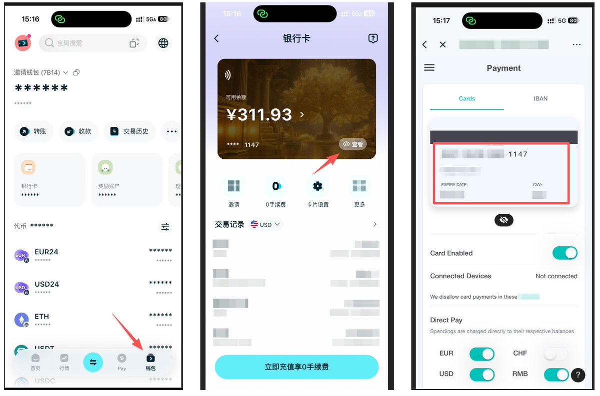打开 Bitget Wallet App → 右下角钱包 → 查看账号信息,即可获取卡号 / 过期时间 / CVV。