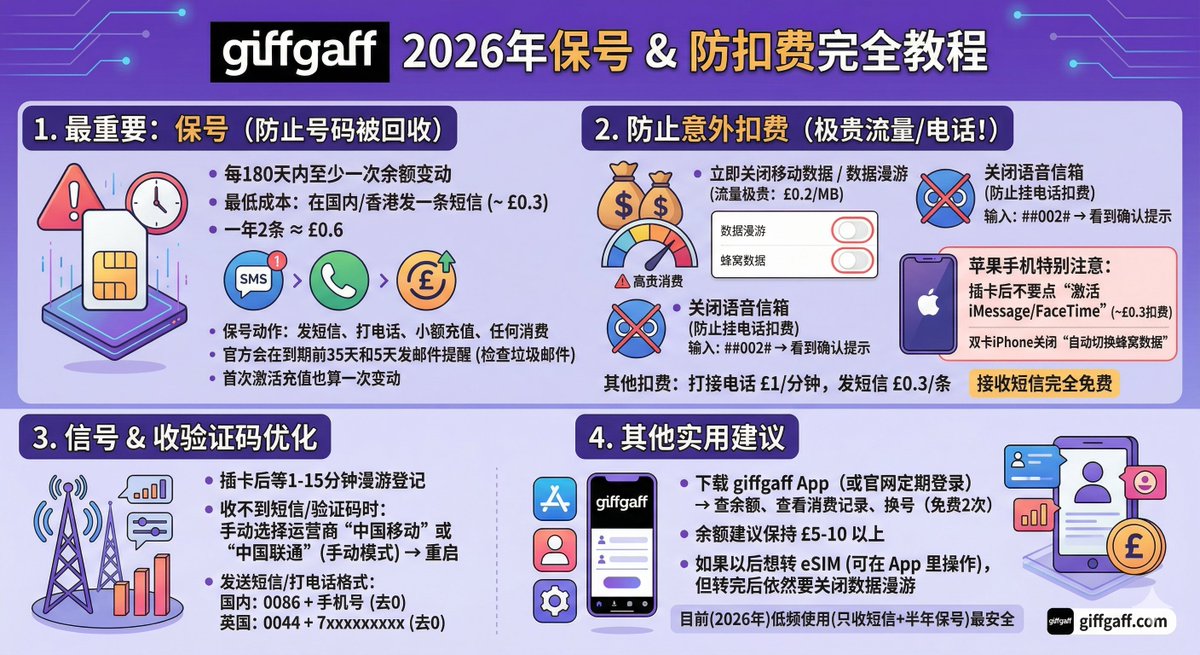 - 余额建议保持 £5-10 以上,防止保号时余额不足。